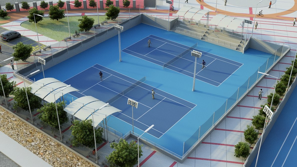 Circuito deportivo con skatepark, canchas de tenis, cancha de fútbol, pista atlética y gimnasio de musculación. Todos estos espacios conectados por áreas verdes, paseo peatonal, zonas de juegos y plazas. El diseño plantea una geometría donde se diferencian dos zonas independientes pero relacionadas: la zona deportiva que dialoga con el entorno deportivo existente en la localidad. Y la zona de paseo y esparcimiento que se aproxima más hacia la localidad. Se estructura en base a muros, losas, vigas y pilares de hormigón armado. Cubierta metálica.